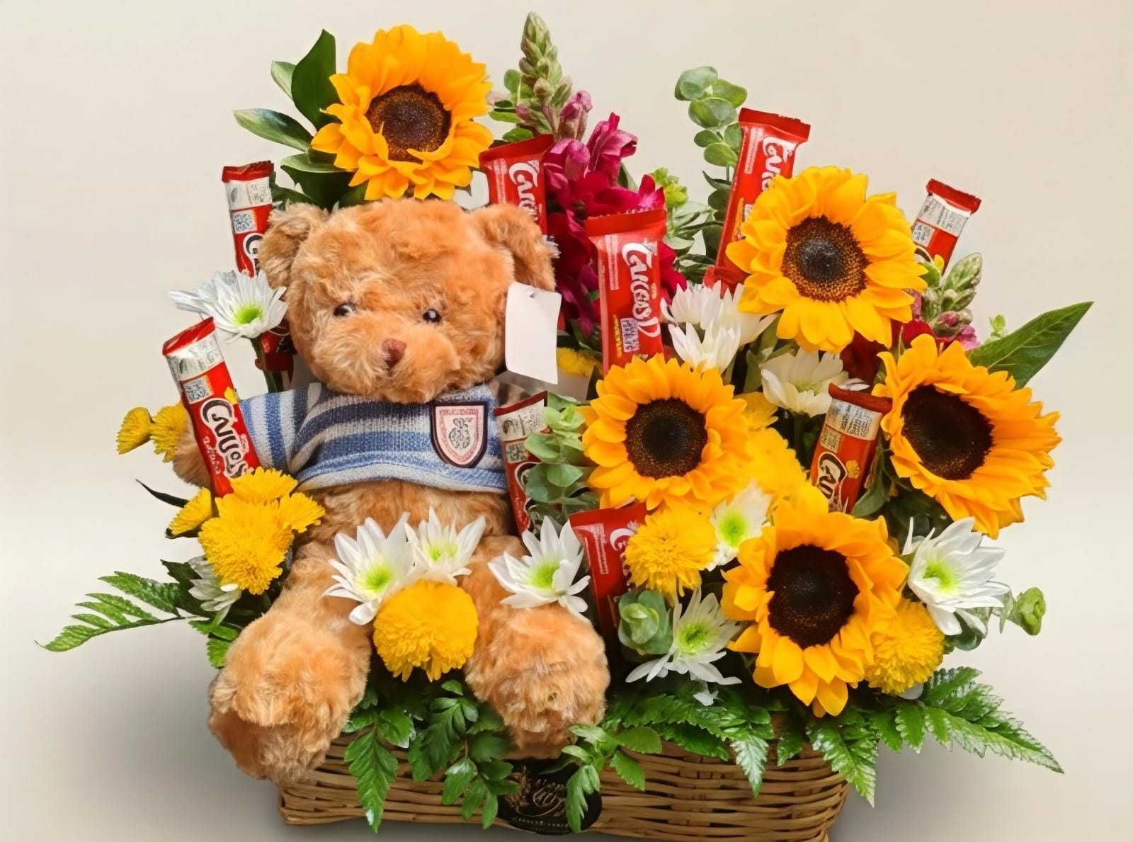 Con oso Lotso: detalle tierno con flores y peluche temático.